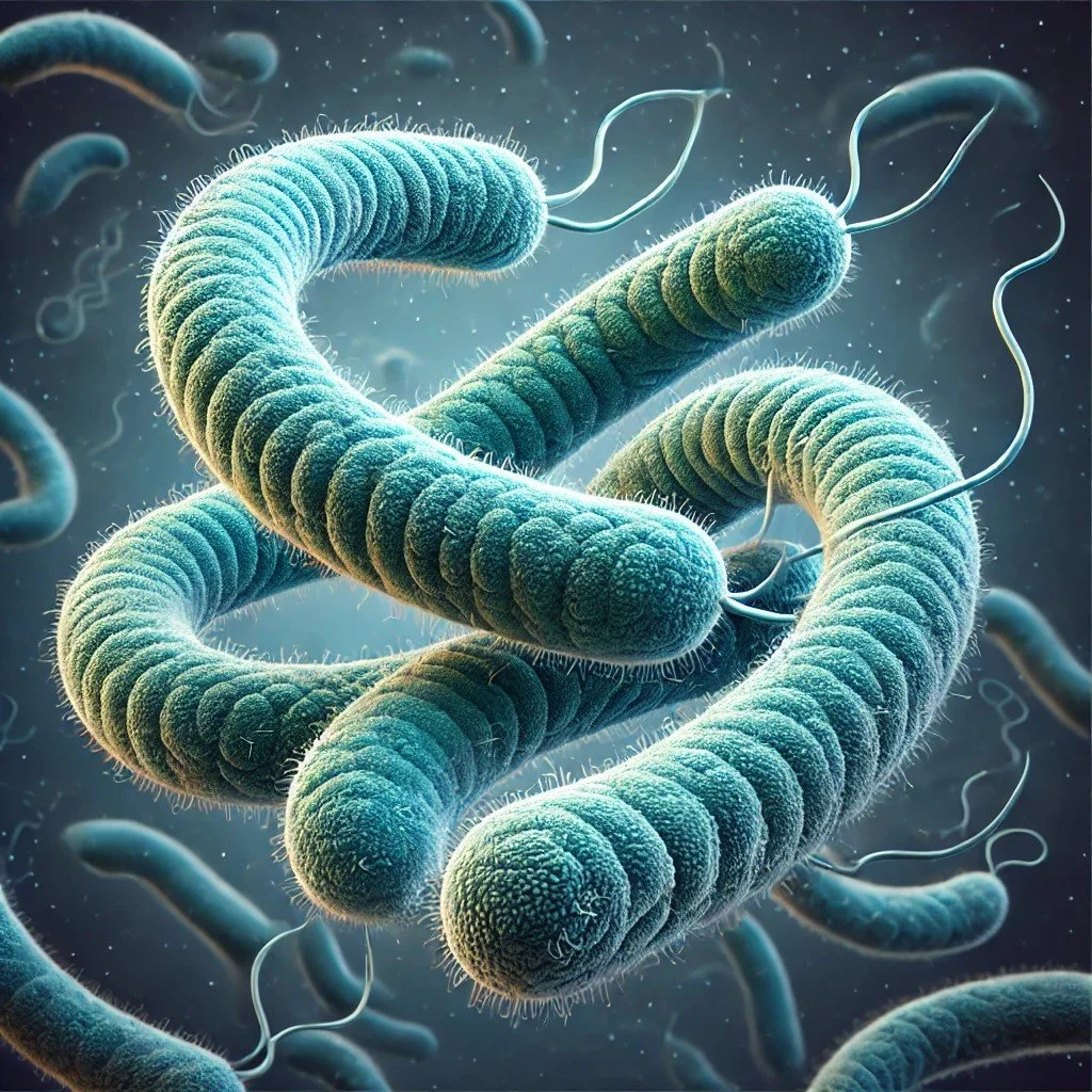 A highly detailed 3D rendering of Campylobacter spp., showcasing its curved, spiral-shaped structure with flagella in a microbiome environment.