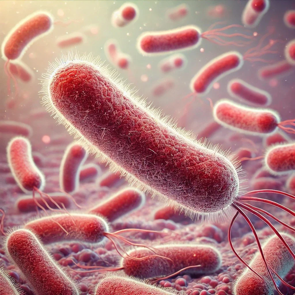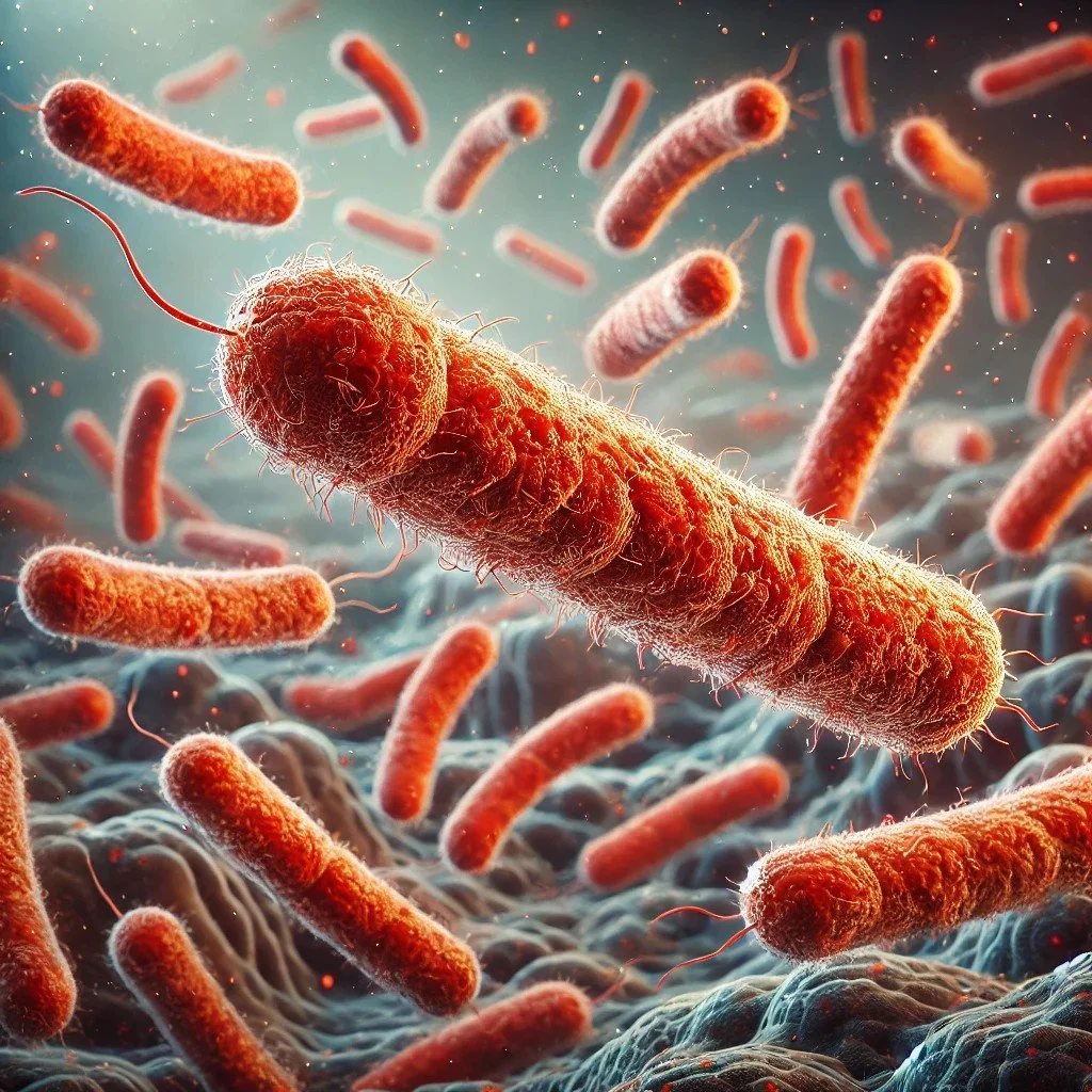 A highly detailed 3D rendering of Escherichia coli (E. coli), showcasing its rod-shaped structure with flagella in a microbiome environment.