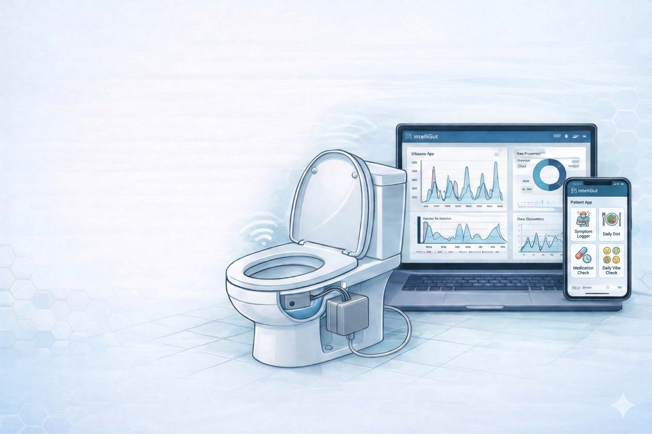 IntelliGut combines a non-invasive, toilet-mounted sensing system with a patient app and clinician dashboard to translate gas dynamics + patient context into actionable insights between appointments.